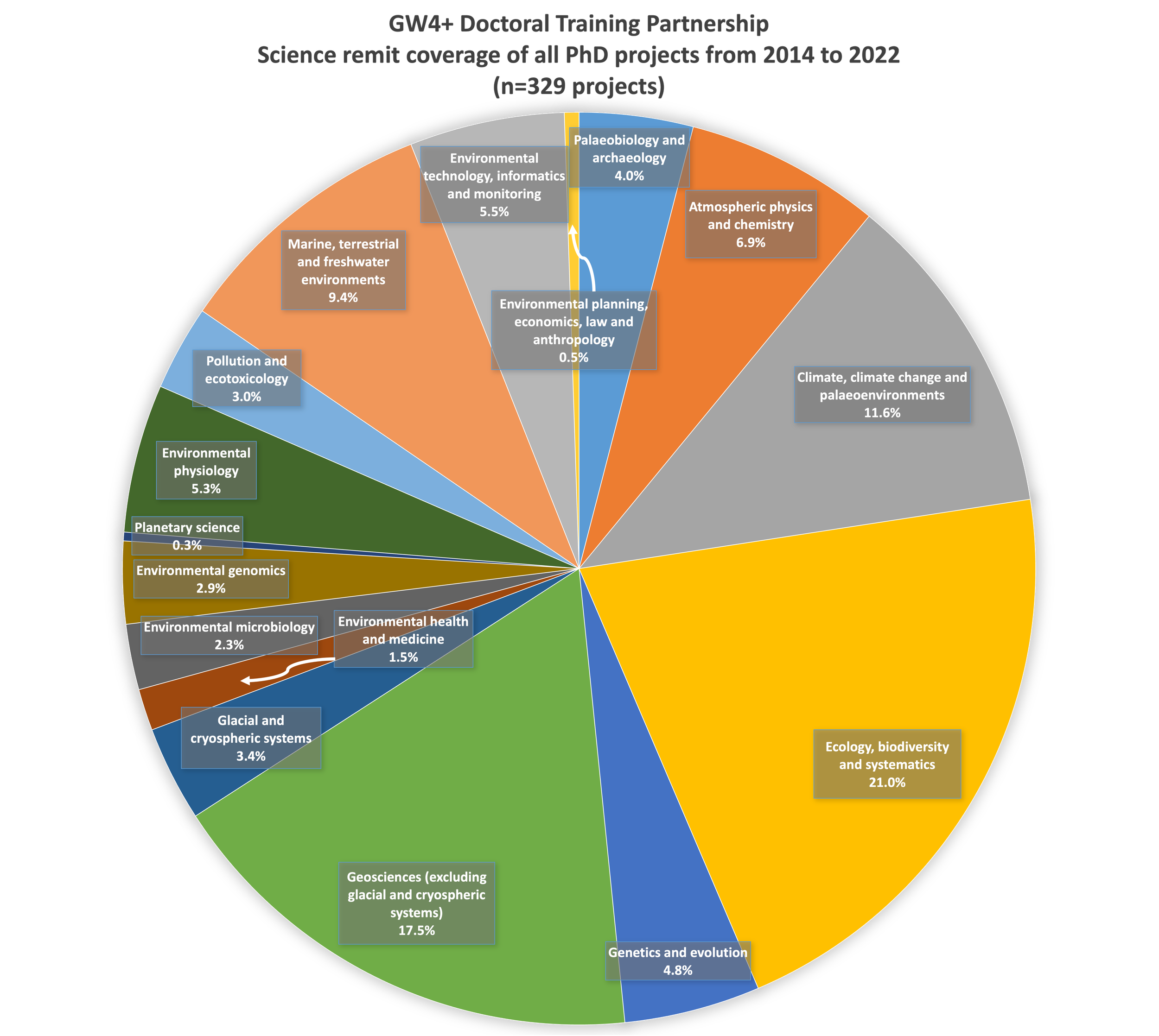 Over the 9 cohorts of PhD recruitment completed from 2014 to 2022, our PhD projects cover all research areas within NERC remit, including many interdisciplinary projects working across different research areas. Taking all projects together, our science encompasses most disciplines within the Earth, Environmental and Life Sciences: